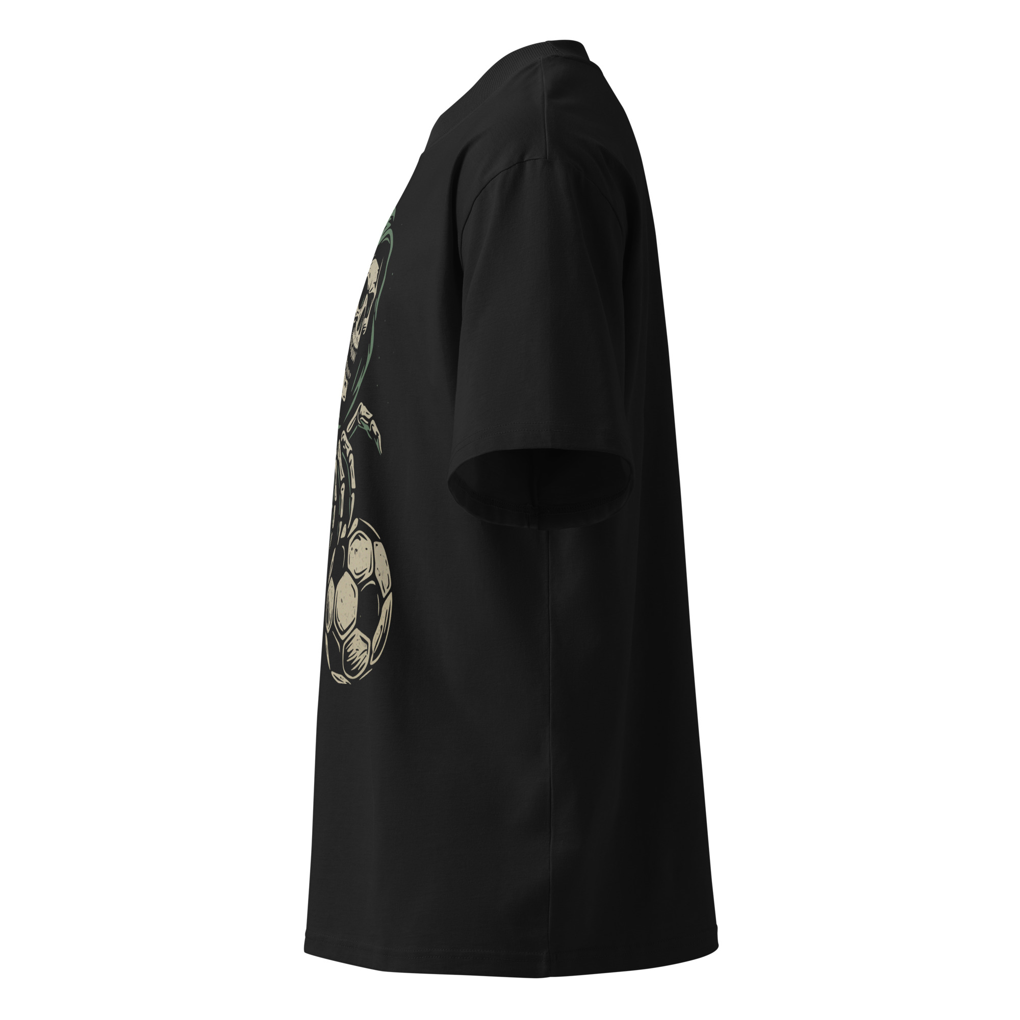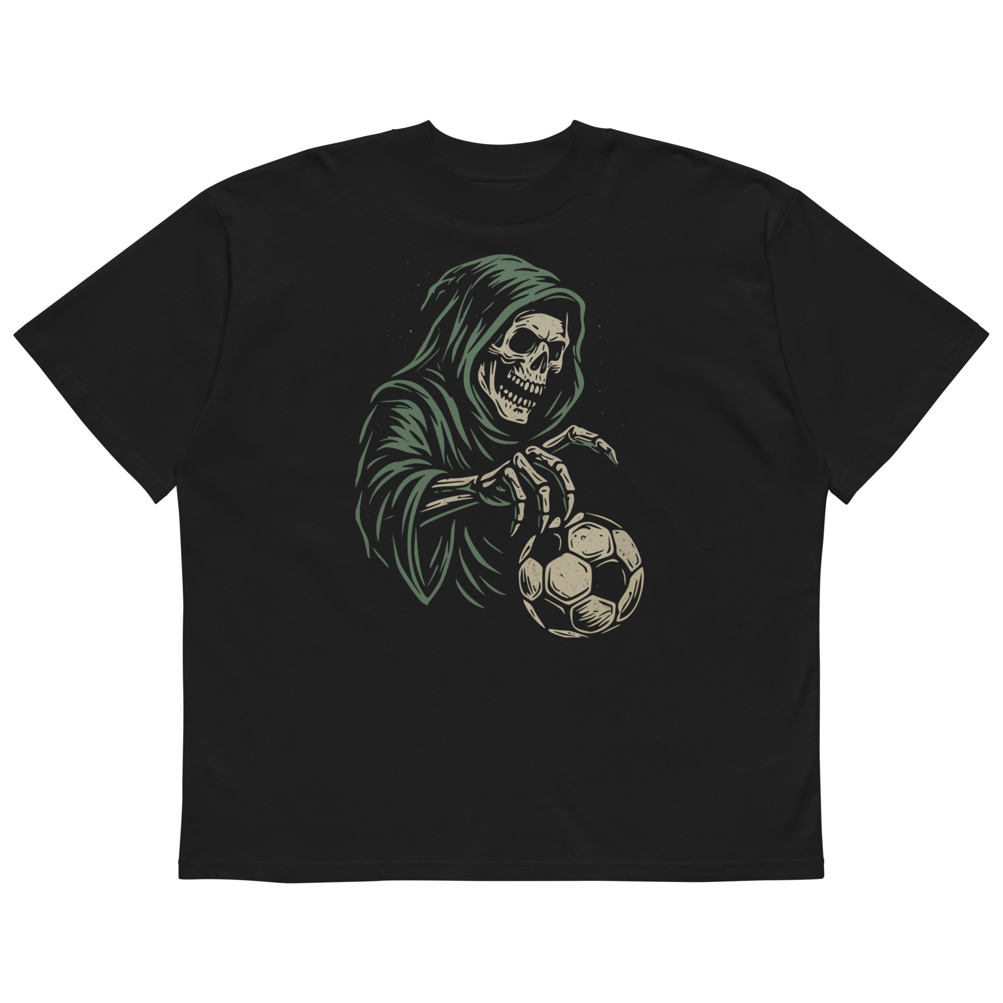 Inspirada en la oscuridad de la grada y en los que viven el fútbol sin miedo, este diseño mezcla la muerte con la pasión: una calavera encapuchada sosteniendo el balón como símbolo de entrega total.